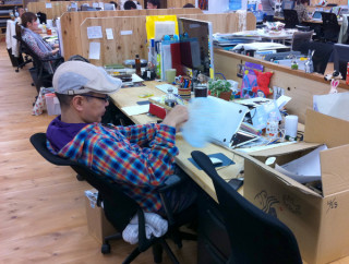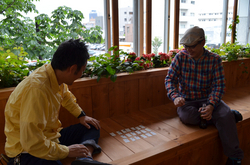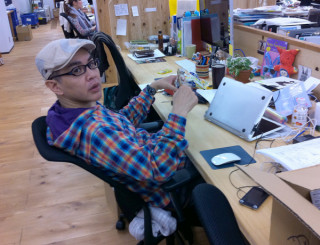 縁側が似合う男。 さっきの製作中の写真(左の写真)を見た読者の方から、 「山下さんと永田さん、なんだか縁側で 将棋してるみたいになっちゃってますね。 微笑ましいっす。」 というメールをいただきました。 そんな 「うちわ」であおいで、冷しはじめました。 左手をうちわにあてがい、ハンチングを目深にかぶり、しぶい表情で、パタパタと小刻みにノートブックをあおぐ姿は、七輪でさんまを焼くおじさんのよう。 「縁側の将棋」に続く、社内の 「昭和の風景」パート2でした。 2011/05/24 21:38 |