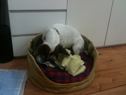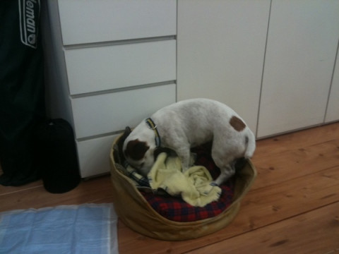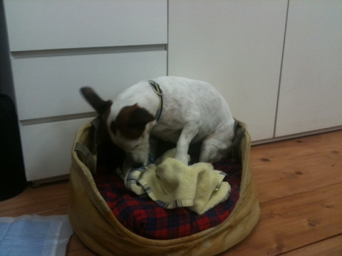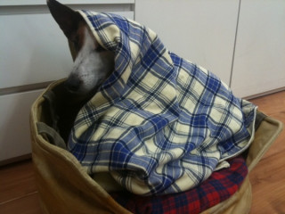 瞬間に立ち会い。 昨晩のこと。 人間のおとうさんが打ち合わせ中、ブイヨンさんがおもむろにもぐろうとしている瞬間が! こここれは、先生の梱包芸術が、いままさに、目の前でうまれようとしているのか! 前足と、しゅっとのびた鼻先で必死にタオルをかき分け、形を創造していく作業です。 連写ですよ。 最終的には、おもぐりにはならずにタオルをくしゃくしゃにした上にちょこんとお座りになられていました。 たいへん無礼を承知で、 「もぐらないんかい!」 と、ツッコミを入れさせていただきました。 さらに、最終の最終的には、わたしがタオルをおかけしたことで、人工的な梱包芸術が出来上がりました。 かわいらしっ! 2011/05/25 10:47 |