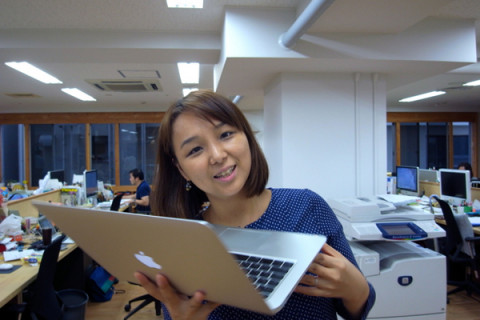 が片手でかるがるとMacBookAirをもって社内を動き回っております。
