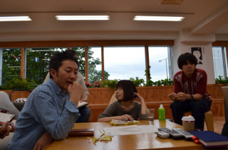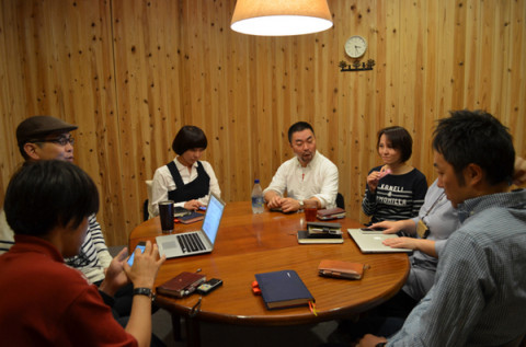 「読み物チーム」の会議がいろいろあった、というのの、うちわ下でございます。 何の気なしにシャッターをおしたので、人々の表情があいまいですみません。 まず一つ目は、毎週月曜日の昼下がりに開催している、定例会議。 「開かれた会議」を目指し、ソファーのあたりで、グズグズになりながら開催していますが、あまり、飛び入り参加がありません。 しかし、本日は、トミちゃんがやってきてくれました。 6月6日の野球中継のことです。 「読み物チーム」は、基本的に、「テキスト中継」に出張ることになっているそうです。 客席で、iPhoneを凝視する、なぜか、PCで猛烈にキーを叩いているなどという人物がいましたら、それは、読み物チームです。 ちなみに、この男、シェフは、野球はサッパリわかりません。 今日は、「ブルペン」について、おかしな発言をしていました。 そんな、野球とガンダムの常識がすっぽり欠落している人物たちの集いは、 「野球とガンダム」という名作コンテンツがございますので、ぜひどうぞ。 社長の描いた「ザク」の絵はすごいですよ。 で、次の会議は、久々の会議。 これは、えーと、発表ができるときになったらしますね。 というような逃げの一手をうちまして、報告を終わらせていただく次第です。 ちなみに、この会議は、読み物チームには珍しく、マクラがありませんでした。 2011/05/30 18:09 |