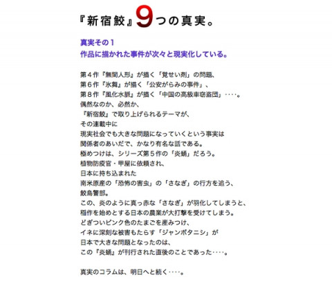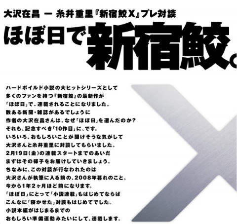 鮫の思いで_その1 そういえば、『新宿鮫』最新作の連載を「ほぼ日」で、というお話をいただいたとき、大沢さんと弊社社長に対談していただいたんです。 ほぼ日で新宿鮫。 で、この対談が行われたのは2008年の暮れだったんですけど、 「ほぼ日」に掲載されたのは小説連載が始まる直前、昨年2月。 小説の開始を待っていたためにこうなったのですが、たぶん、ほぼ日史上もっとも「寝かせた」コンテンツでした。 おふたりのやりとり、何回読んでも本当におもしろいのであらためて、ぜひどうぞ。 あ、糸井さん、 「カシミアのTシャツ」着てる! なつかしいなぁ。 思えば3年越しくらいのプロジェクトになるんですねー。 「もう少しで『新宿鮎』が 出るところだった」 「鮫島は両津勘吉に 助けられたことがある」 など、各回の最後に載せたコラム 「新宿鮫9つの真実」も好評でした。 とくに「真実_その7」は大沢さんが直々にお電話をかけてきてくださり、 「こんなのもあるぞ」とわざわざ、教えてくださったんです。 受話器越しの音の感じから、そのお電話は 「夜のお店から」のようであったこともなつかしく思い出されます。 『絆回廊 新宿鮫X』アマゾンのページはこちら。 2011/06/02 14:58 |