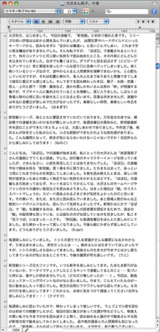 鮫の思いで_その6 フフフ、フフフフフ‥‥。 覚えてたんですか、みなさん。 いや、そうでしょう。 ご協力くださったみなさんは忘れませんよね、あの計画のことは。 (なにがなにやら、というかたは こちらのページをご覧ください。 『絆回廊』の終了から5日間くらいの間、 ほぼ日のトップページに 上記ページへの秘密の扉があったんです) この製作中のページはきっと大沢在昌さんは見ていないので発表してしまいますね。 なんと、400通を超えるメッセージが届いたのです! しかも、ひとつひとつの文章が、非常に長い! 写真は、全メッセージを整理したファイルですがこの文字の小ささと右側の青いスライドバーを見てください。 その分量の多さが、おわかりになるかと思います。 いただいた感想やメッセージは、もちろん、全て冊子に収録いたしますが、新書サイズとかでつくっちゃったらかなり、ぶあつい冊子になりそうです。 いったいこれ、どんな本になるんだろう。 デザイナーの ともあれ、予定どおりに、6月12日(日)の夜20時くらいから、Ustreamの生中継で大沢在昌さんサプライズ大作戦を決行いたします! お届けするのは、写真の鮫チーム。 詳細は、6月10日(金)のほぼ日ニュースで発表いたしますのでメッセージを送ってくださったみなさんは特に、たのしみにしていてくださいね! それではひとまず、『絆回廊 新宿鮫X』の単行本をどうぞ、よろしくお願いいたします。 2011/06/02 19:56 |