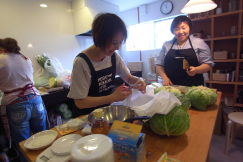 つくりまーす! 「きょうは、餃子をつくる日ですよ! 先週、話したじゃないですかー」 そうだったそうだった。 暑気払いにみんなで 『LIFE2』の飯島さんレシピの餃子をつくって食べて、ビールも飲んで、矢沢永吉さんのDVDも観よう! という会だったんでした。 「みなさんにも順番で 餃子を包んでもらいますからねー」 はいっ、まかして。 けっこう得意です。 あれ? ちょうさんその包丁、イニシアルが。 「KK」 ‥‥切れる・啓子? 「ちゃいますよー。 結婚したとき買った 堺の包丁です。 夫とふたりでイニシアルを入れたんです」 ひゃー、すてきなお話! しかも、よく切れそうー。 このあと乗組員たちが順次餃子づくりをするようす、ゆるゆるとここで中継していきまーす。 2011/06/13 11:23 |