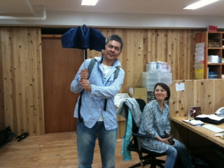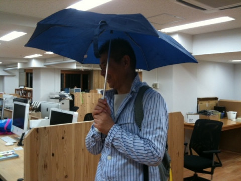 「さ、帰るかな」と言いながら室内で、もう折りたたみ傘を広げる