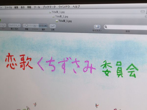 くちずさみメール こんにちは、恋歌くちずさみ委員会です。 今日もくちずさみTシャツを着ています。 今日は委員で、あるコンサートに出かける予定なんですよ、それはさておき。 こんなメールをいただきました。 恋歌くちずさみ委員会の皆様、こんにちは。 わたくし、35歳です。 上の世代の歌も結構知っているつもりでいました。 しかし、紹介される歌をほとんど知らなくて、それなのに皆さんがつるつるしていて、少し悔しい気分です。 数えたところ、現在、5勝20敗1引き分けです。 やっぱり「懐かしの・・」みたいな番組から得た知識ではかなわないのか? でも、歌を知らなくても、皆さんの掛け合いを楽しんでいます! いつからか、雑談風になりましたよね? スガノさんの乙女発言、山下さんがしみじみと、永田さんが冷静な分析、シェフさんは歌の情報解説とちょっとミーハーなノリで。 ひょっとして普段からこんな感じでお話されてるんでしょうか? だとしたら、素敵なお仲間だなぁ。 40代になるのもいいかも、と思えました。 (緑アイルー) 5勝20敗1引き分けですか! そんなふうに数えてくださって胸いっぱいです。 でも、いちばん年上の そして、普段のみんなの会話も、きっとこんなかんじだと思います。 ところで、左にずらっと並んでいる画像は 恋歌くちずさみ委員会のメインタイトルデザインができあがるまでの道のりです。 現在のタイトルデザインも、バックにあるハートや星が全部手描きで 「フォトショップでパス切り」してあって、おそろしくなる作業なのですが、そこに至るまでの試作もハンパありませんでした。 「委員会だし、ハンコをつくったことも あったんだよ」 だそうです。 2011/06/22 14:28 |