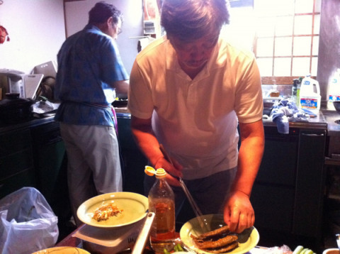 ことしもあります! 伊賀の土楽に来ております土鍋チームの きのうは福森雅武さんと、おともだちの下(しも)さんが、きょうは福森道歩さんと柏木円さん姉妹が、料理をつくってくださってます。 できた料理は、できたてのカレー皿に盛りつけ、大江カメラマンが撮影中。 ふつかでおよそ20品の料理を撮影する予定です。 もちろんカレーも盛りますが、このお皿、なにを盛っても、絵になるんですよ‥‥! 発売は7月下旬以後の予定です。 新製品も、ありますよ。 どうぞお楽しみに! 2011/06/30 10:37 |