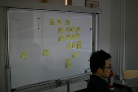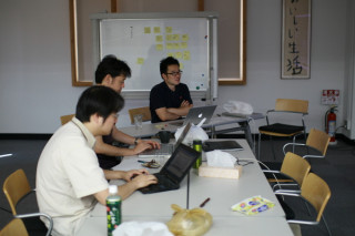 各自のパソコンを使って、個別に作業しながら、どこをどう変えたか、大きなスクリーンで共有しながら作業を進めているようです。