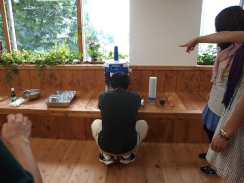 夏だ、かき氷だ! しょうがチームが、 「はじめるよー」とみんなに声をかけ、みんなで集まってみると、なんと、かき氷。 わいわいと、作っては食べ、作っては食べ。 かき氷に、 「手かげんしないしょうがシロップ」 をかけてアレンジをすると、風味が効いてものすごくおいしいです。 かき氷で、「辛い!」なんて経験したことがなかったのですが、とにかく、うみゃいっ! 明日から、また今月の分の販売がありますので、ぜひ試してみてくださいね。 この模様はまた改めて公開される予定なので、おたのしみにー。 2011/07/28 17:19 |