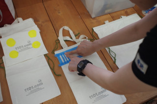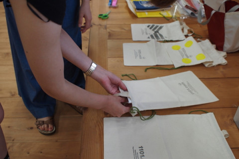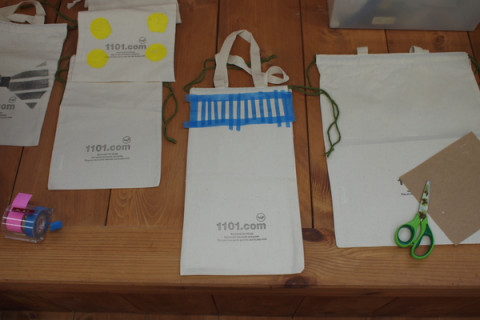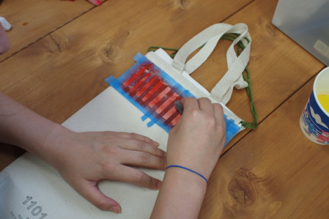 カスタマイズするぞ!4 そうそう、せきぐち先生。 実はこれ、友達の誕生日プレゼント用につくってるんですよ。 「え!そうなんですか。 この水玉もかわいいですけど、 せっかくだから お誕生日仕様にしましょうよ!」 え!せんせい!! 「袋の上の方に ろうそくが並んでる感じとか。 うん、かわいいと思いますよ。」 え!せんせい!! 一体どうやったらいいんですか、それは。 「マスキングテープでやったら たぶん簡単にうまくできますよ。」 先生のナイスアイデアに言われるがままやってみました。 たしかにこれをステンシルみたいにスポンジでポンポンやればろうそくみたいにみえそうかも。 色は先生のおすすめの赤っぽい色を選びました。 先生すごい。 先生は偶然性をたのしんでいるわ。 私は必死です。 (先生のアドバイス。) 布に色をつけるときには下の布に色うつりしないように、紙を敷いておくといいそうです。 参考:一番下の写真です。 2011/08/04 12:30 |