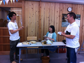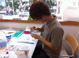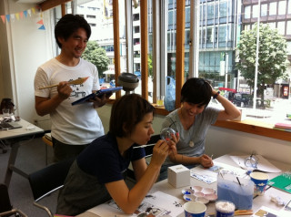 お昼休み中です。 ライブ・ペインティングがはじまって、約2時間半。 たくさんのかたに中継を見ていただいて、どうもありがとうございます! 大きなブタフィーヌさんが、どんどんできていくので、たかしまさんも、ノリノリで描いてくれているようです。 ブタフィー江戸風鈴隊も、もくもくと順調に進んでいる様子。 ロナウドを描いている 「あー、ロナウドがキリッと しすぎてしまったー」と言っていると、たかしまさんもちょっと筆を止めて、 「いえ、ロナウドはキリッとしてて いいんですよ。 でも、縄目が結構リアルですね。」 なんて、直接アドバイスも。 休憩あとも、またのぞいてくださいね! 2011/08/05 13:33 |