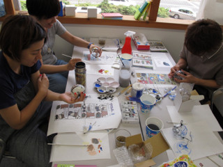 ライブペインティング後半戦スタートです。 さてさて、少しばかりの昼休みを終えて、 ライブペインティングの後半戦がはじまりました! 「え、これってもう完成ではないの?!」 と思ってしまったのですが、 たかしまさんいわく、 「ここからです」らしいですよ! それは楽しみです! その横でこちらもそれぞれに格闘しているブタフィー江戸風鈴隊ですが、まもなく予定の時間が過ぎようとしております。 が、みんな一筆一筆に力が入っておりまして、自分の満足いく図柄を執念深く追っているせいでなかなか思うように作業が進んでいないご様子。 少しだけ心配です!! 後半戦もお楽しみに! 2011/08/05 14:17 |