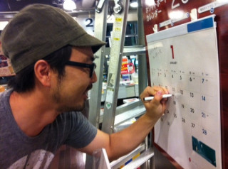 「ほぼ日ホワイトボードカレンダー2012」の試し書きをするムネヒロ。