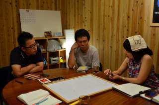 その1。 じつは、菅野さんやおっくんには、とある仕組みが前々からほしいなあ、と、思っていたそうです。 それは、きくだに、 「あったらいいな。」 とおもう仕組みです。 その仕組は、さっさと具体化するに限るぞ、とおもって、動き出したら、べいちゃんとぐっさんが話に乗ってくれました。 でかい、ホワイトボードにラフと文言をかいていきます。 これで、きまりだ! とおもったところで、べいちゃんもぐっさんも自ら盛りました。 なんと、とある仕組みが二種類出来上がる予定となったのです。 たぶん、11月くらいに、華々しくデビューします。 2011/09/14 19:09 |