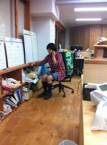 ごろごろという椅子の音とともにあらわれ、電話をちゃきちゃきとかけている様子です。