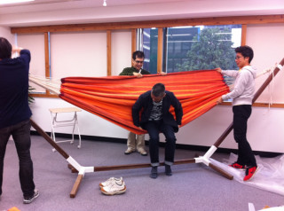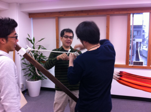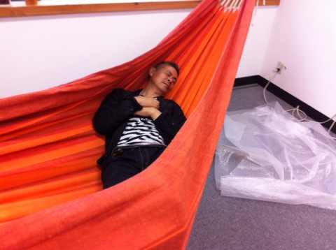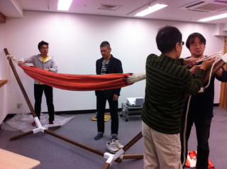 ハンモック 「今夜さ、おれもいっしょに ここで寝たかったんだけどさ、 いまから出かけなきゃならないんだよ。 だから、のせて、ハンモック」 どうぞどうぞ、ここにハンモックを設置して、社長が最初の横たわりビトです。 「すみませんね。 ‥‥よいしょ。(すとん、ぺたん) 痛い。なにこれ、痛い」 すみません、張りが弱かったです。 おしりが床にあたって痛かったですか。 「痛かったけど大丈夫。 でも、いまされた仕打ちは忘れないよ」 よっこらしょっ(締め直す)。 はい、今度は大丈夫です。どうぞ。 「‥‥よいしょ。 おおおーーーー。 いいじゃなーーーい。 これは、寝るね。 ゆーないとさんは、ひとたまりもないね」 この状況がなんのことやらさっぱり?という方は こちらをご覧ください。 UST本番は9時スタートですが、そのちょっと前からゆるゆる配信ははじめてるかも? 今宵、うとうとしましょうね。 2011/10/05 16:59 |