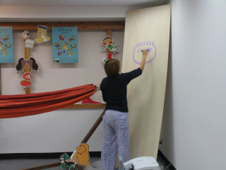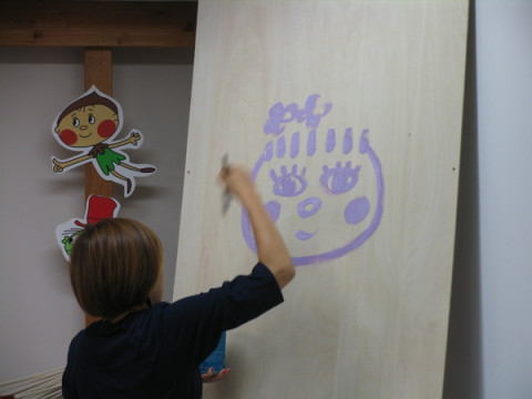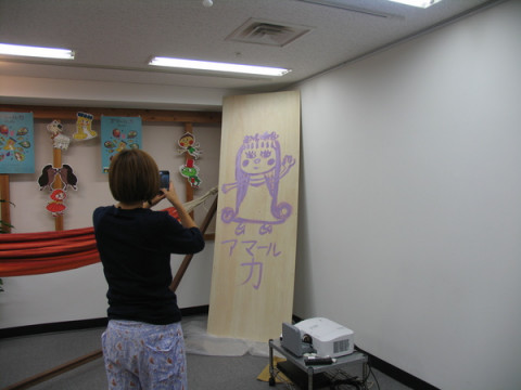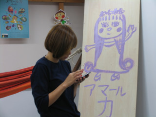 はじまりました! 『アマールカ』のユースト中継! ついさきほど、スタートしました! 会場の真ん中に描いてあるのは、 アマール力(ぢから)では、ありません。 ラベンダー色のペンキは、もちろん前に、こちらでご紹介した、カラーワークスさんで作ったオリジナルのペンキ。 できばえに、満足したのか、記念撮影をして、そのあと、ツイッターで、なにやらつぶやいたようです。 もうすでに、 1話終わるごとに、ツイッターで起きていることを証明するようなので、お話しが終わっても、ツイートがされなくなったときが、寝たときだとか。 はたして、何話見られるのでしょう? (ハッシュタグは、#hobo_eventです。) 2011/10/05 20:43 |