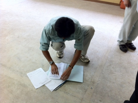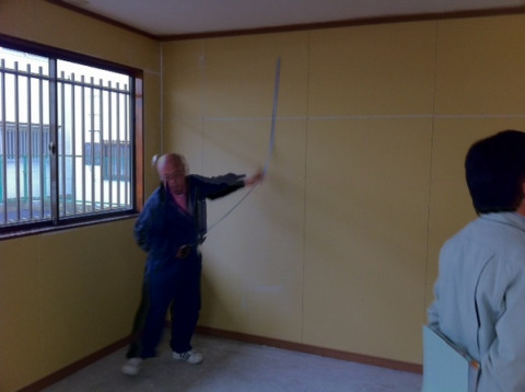 おっと、スマートなメジャーさばき、そして、床記入。