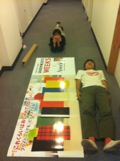 きのうの夜のことです。 きのうの夜のこと。 デザイナー田口による、 「ほぼ日手帳 2012 WEEKS」 特製ポスターが完成しました。 本日、丸善丸の内本店イベントで登場しているのは、これです! 2メートルを超えるポスターを見ると人は、隣で横になりたくなるのはなぜなんだろう? みなさま、本日21:00までやっておりますのでぜひ、「WEEKS」を見にお立ち寄りくださいませ! お待ちしております。 キノシタでした。 (キャンギャルのかたがた、声がかわいいなう。くーっ!) 2011/10/18 13:07 |