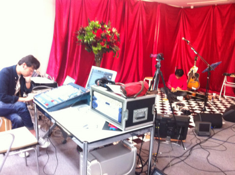 密かに困っている宇宙部の沢柳と、ギターの弦を張り直す田島貴男さん。