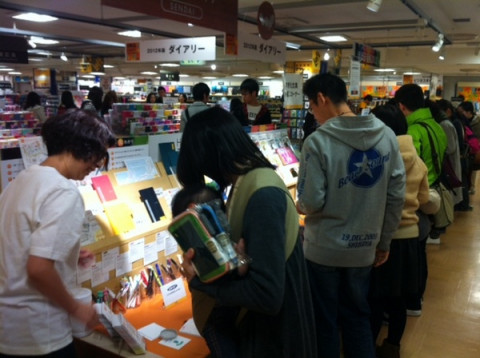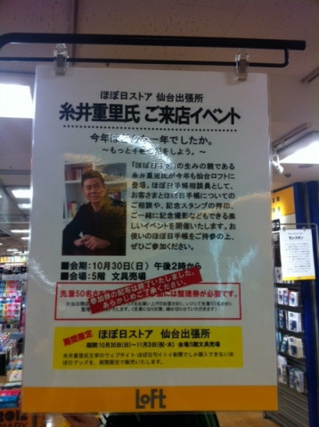 朝からにぎわっています。 おはようございます。 仙台ロフト、開店早々、大変なにぎわいです。 smileカバーを手にとってくださる方、すぎえ文具をためしてくださる方、ハラマキを手にしてくださる方も発見! そして、まさにいま、整理券の配布が終了したようです。 朝からのご来店ありがとうございます! 糸井重里は14時に登場します。 整理券がなくても、すぎえとさくらの手帳説明や糸井相談員の話は、聞いていただくことができます。 開始時間まで店内やすぎえ文具をゆっくりお楽しみください! 2011/10/30 10:29 |