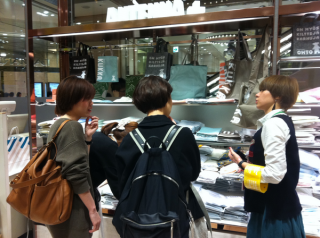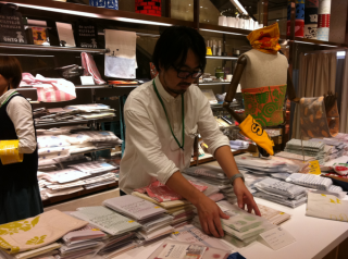一生懸命、ハラマキのよさをお客さまにお伝えするゆーないと、時間を見つけては、商品をきれいに陳列しなおすムネヒロ、おかげさまで、どんどん店頭からなくなっていく商品を、バックヤードから随時補充していく木下リーダー。