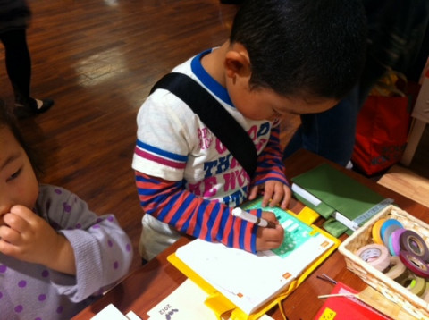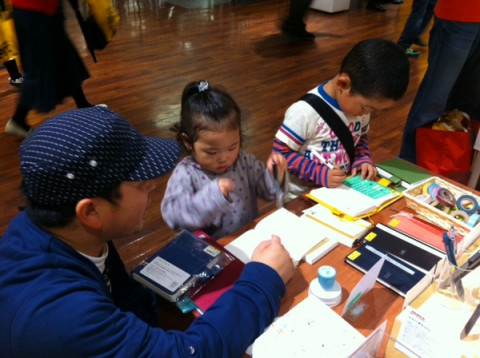すぎえ文具のお試しコーナーで親子で手帳にいろいろ試してくれているのは福島県会津からお越し下さったカンケさん。