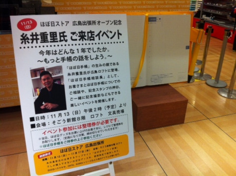 広島ロフトより。 おはようございます。 仙台、新潟とお邪魔してきました ロフトでのイベント 「今年はどんな1年でしたか。 もっと手帳の話をしよう。」、本日は広島ロフトに来ています。 糸井相談員と相談ができる整理券は早々に配布が終了しました。 朝早くからおこしいただき、ありがとうございました! 14時からの糸井相談員のご挨拶やスギエ文具のお試しは整理券がなくても参加ができます。 お近くのかたは、お昼を食べて、ちょっとゆっくりしたら来てくださいね。 そして、ここ、広島ロフトには、 あの動画に登場していたマキノコレクションの生地でつくった特製の洋服も持って来てみました。 記念撮影も大歓迎です。 よかったらどうぞー。 2011/11/13 10:52 |