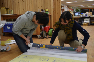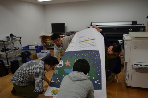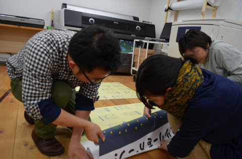 見かねるということ。 あれは‥‥。 フライデーナイトのことじゃった。 おまけにアラウンド・ミッドナイト。 ってなんで英語? トヤマちゃんが、翌日、吉祥寺でおこなわれるたかしまてつをさんのライブペインティングのパネルをつくっていたのだ。 終電間際に。 まず、山口工務店店員の西田マンが見かねて手伝いにきた。 しばらくやいやいやっていたのだが、むこうのほうから、べいちゃんが、 「なんだなんだ」と見に来て、見かねて手を動かし始めた。 そして、パネルの出来上がりをまちながら、翌日の段取りをつけていた西本さんですら‥‥、騒ぎをききつけてやってくる。 もちろん、見かねて手伝いはじめた。 私は、それは、見かねられすぎだろう。 とおもって、遠慮して見守っていた。 2011/11/21 10:57 |