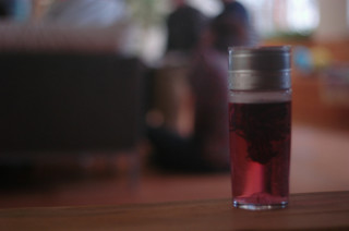 簡さんのハイビスカスの花茶にお湯をつぎに窓際に来たらば、ホントだ、