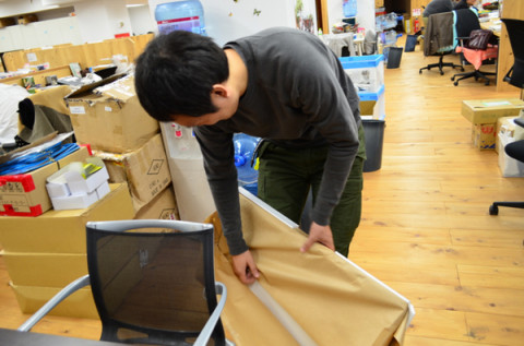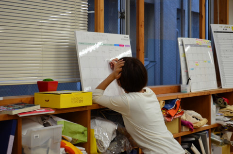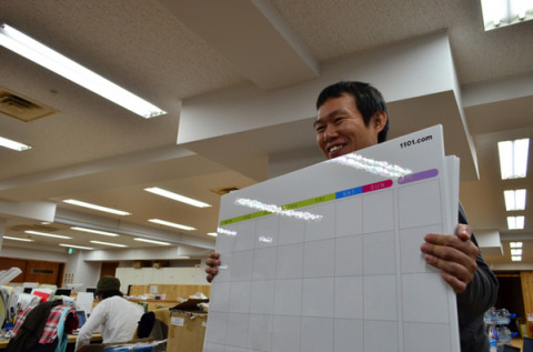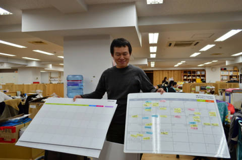 リニューアル。 ぐっさんが、紙包みをかかえて向こうからやって来ました。 「できましたよ! おねがいされてたもの!」 こういうときのぐっさんは、まこと嬉しそうでございます。 「じゃ〜ん!」 なにをお願いしていたかというと、 「大ホワイトボードカレンダー ハレパネはりつけ仕様」 です。 われわれ、 「読み物チーム」は顔をつきあわせてスケジュールの相談をすることが多いので、管理もアナログに、 「大ホワイトボードカレンダー ハレパネはりつけ仕様」に付箋をはって行います。 そのボードが、ながいことつかってへなへなになってきたので、ぐっさんが作りなおしてくれたのです。 「あのね、よーくみて! 枠が8あるでしょ! 月火水木金土日ともう一つ! これね、 『だいたいこのくらい』っていう時に 使って。」 あ、そりゃいいね。 日付はギリギリまで確定しないですからね。 「保留」機能があるとうれしいです。 「ところでさ、ぐっさん。 これ、カレンダー、 5段しかないんだけど‥‥。」 「ん? ん?」 「いや、1月のカレンダーをご覧よ。 一段足りなくなるって。」 「あ!」 「あ!って。 まあいいよ。次のつきに、 あまった日にちは押しこむから。」 そうそう、モーマンタイ。 モーマンタイ。 あ、そうそう、 「気仙沼のほぼ日」のカレンダーも出来上がったんですよ。 気仙沼・はなえ姉妹の片方、ナカバヤシが、カレンダーを前に、誰がいつ出張にいくか、など記録をつけていました。 2011/11/25 15:52 |