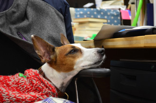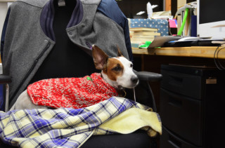 肘掛けにあごをのせて。
