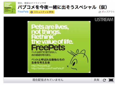 USTがあるそうですー! ほぼ日上でもご紹介していた、動物愛護管理のあり方についてのパブリックコメント。 提出期限が明日となりました。 それにともない、mignon友森さんや、坂本美雨さんなど、21時からUstreamにて 「パブコメを今夜一緒に出そうスペシャル(仮)」をされるそうですので、書きたいけどまだ書いていない方、 「なんかむずかしそうだから、 よくわかんない!」 という方、これを見ながら、一緒に提出しましょう。 今回のパブリックコメントについての解説をいろいろ聞ける(はず!)と思いますので。 http://www.ustream.tv/channel/freepets 2011/12/06 20:10 |
