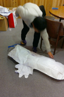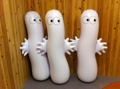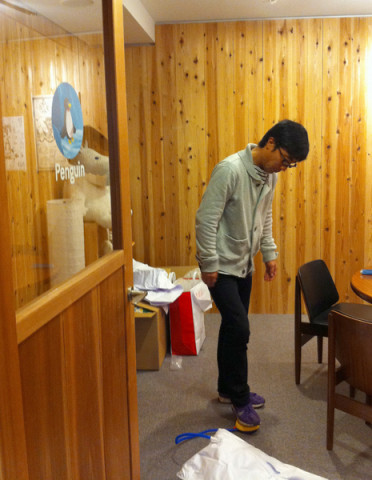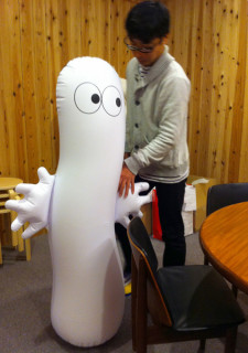 ムーミン谷、出現!? 通路を歩いてたら、向こうのほうから、 「シュ、シュ、パフュ、パフュ、 シュコ、シュコ、パフ、パフ」 という、なにやら耳慣れない音が! えんえん続いているので、気になって音のするほうに、ずーっと歩いていくと、ミーティング・ルーム「ペンギン」で、もくもくとステップを踏んでいる 日々、ランニングをかかさない彼のこと、新しいトレーニングか!と思いきや、空気入れでなにかを膨らませている様子。 「そんなところで、 なにをふくらませてるの?」 巨大ニョロニョロです。 140センチあります。」 だって。 よく見ると、壁にはいつもの額に変わって、 「ムーミン・キャラクター」のポスターと、その隣りには… 「ムーミン谷の地図」? 木に囲まれただ円形のここペンギンの部屋は、ふだんから、 フィンランドのサウナみたい、と呼ばれてたけど、 「ムーミン」キャラの出現で、ますます、「フィンラン度」UP! 「ムーミン谷か」と自らつっこんだり、言われたりする、「ほぼ日」に、ついに、本家「ムーミン谷」が出現しそうな感じです。 いったい、なにがはじまるのでしょう? ニョロニョロもすみっこで、見守っているようです。 このつづきは、またあとで? 2011/12/09 14:21 |