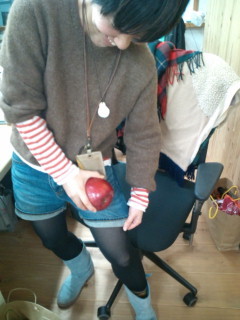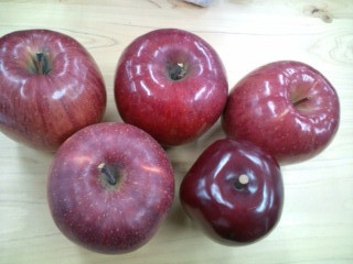 磨きに磨いた3人のりんごと、磨いてない私のりんごと、さらにいつのまにか、食べられない飾りのりんごも混じってます。