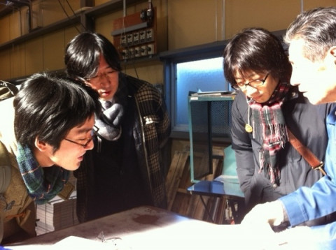 製本の糸かがり工場で説明を受ける我々メガネです。