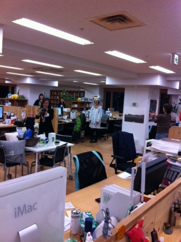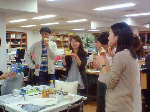 バースデイびと。 年の瀬がせまりくるわ冬至の今日は連休の前日だわで、ここのところ浮き足立ちモードな、社内。 しかしそれでも誰かのお誕生日はやってきます。 今日みなのお祝いを受けたのは、 ちょっとすごい人と同じ誕生日の、 写真を撮らせて〜といったら、なぜかブータン国王のバッヂと写りたがりました。 なんだろう。玉の輿願望!? 入社4年目になるけど、正社員ではずーっと一番年下の、 先日、経理の中原さんが入社して、ついに同い年の仲間ができました! いいよね‥‥同級生って。 来年も楽しくなりそうだね、 さていっぽう、それとは関係なくいただいたシフォンケーキを、手づかみでおいしくいただく年の瀬の面々。 あと数日がんばって、いい年を迎えましょうね〜。 2011/12/22 21:17 |