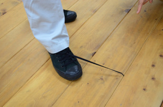 靴の紐が、板張りの床の継ぎ目にはまり、びちっと突っ張った瞬間です。