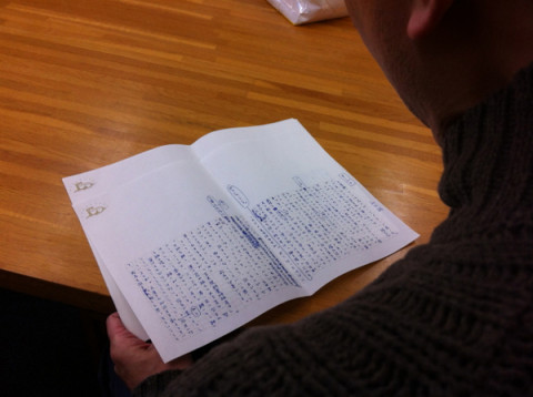 和田誠さんの原稿 編集者の松家さんと和田誠さんの事務所に来ています。 和田さんは、本日、何本か原稿をくださいました。 手書きです。おおおー。 原稿用紙の上部にスペースがあるのは、絵を描くためだそうです。 「映画をつくったときに、 絵コンテをそこに描いて 下に原稿を書いてたわけ。 それで、プロデューサーに見せるの」 と、和田さんは教えてくださいました。 手書き原稿をいただくと、とても緊張します。 「たしかに、ちょうだいいたします」 と松家さんはおっしゃって、はらはらしながら早歩きで (コピー機の前がゴールです) ふたりで事務所に戻りました。 2012/01/31 18:00 |