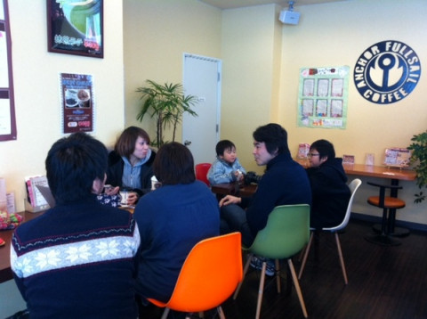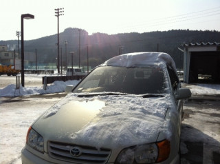 アンカーフルセイルコーヒー 気仙沼に入る前の恒例、道の駅かわさきのフルセイルコーヒーにて小休憩です。 今日は、打ち合わせにやってきたコイケ、西田、ナカバヤシに加えて、土日を利用して家族旅行にやってきたちょうさん一家もいらっしゃいます。 お店の人に聞いたら、昨日までもっとすごい雪だったから晴れてよかったですね、と。 ええ、ほんとに、よかった! フロントガラスの剃り込みは解消されましたが、頭には雪、足回りにはつらら、で、ふたたび出発です。 2012/02/04 10:56 |