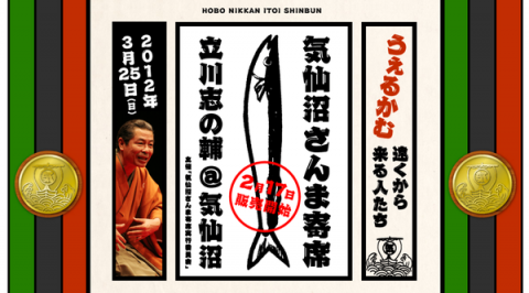 さんま→志の輔! 気がつきました−? 今日の気仙沼さんま寄席のページ。 情報がてんこてんこもりもりで更新されたのはもちろんなのですが、一番上のところ。 昨日までは縦長の「さんま」さんがどーんといたのですが、今日からはいまにもさんまについて、ガッテンしそうな志の輔さんになっています。 この絵は、電話黄昏で 気仙沼の特設プレイガイドでは志の輔さんの絵をあしらったポスターも貼られる予定。 イベント当日は会場にも貼られます、きっと。 (ね、ぐっさん) ツアーやチケットの販売は明日2月17日11時からです。 どのツアー、どのチケットにするか、もう決まりました? 2012/02/16 16:17 |