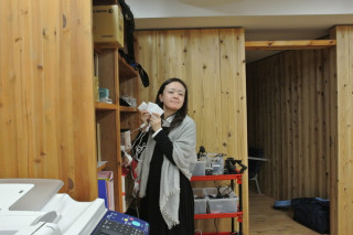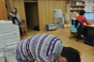 横切る背中 「何してるのかな?」と近づいていったところ、大きな背中が横切りました。 屈んでいるせいでよけい大きく写りました。 彼はよく、ご家族や友だちからやらなくてもいいことをやって叱られるそうです。 だから、なんにもしないようにしてるんです、と言います。 気を取り直しまして、モギのところへ。 彼女はバッテリーの充電中でした。 なにやら、来週の火曜にある中継のロケハンに行くのだそうです。 本番は3月2日あたり。 そんなにバッテリーを持っていく中継って、いったい‥‥? 2012/02/17 16:58 |