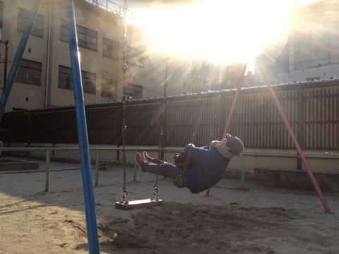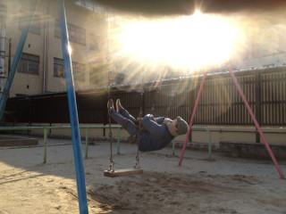 山下は、西日をバックにブランコのひととき。