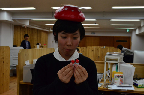 閑話休題のきのこ。 いや、本の話ばかりでもナニなので、あいだにきのこも挟むことにする。 お客様から、きのこの形をしたでっかい瓶にはいったきのこのチョコレートをいただきました。 (W&Sのハラダさん いつもありがとうございます!) そのきのこのかさの部分がまあ、帽子ににているわけですね。 もちろん、誰かがかぶります。 弊社の場合は。 今回は、さくらちゃんがきちんとかぶってくれました。 社歴が浅い中で、天晴であります。 「なんか、きのこのチョコもたされたら、 急にほっぺたが赤くなってきた。」 そこまでしておいていうてる場合か。 2012/03/15 11:05 |