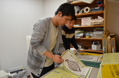 アルバイトの順平くんが、西田マンからハレパネの貼り方を教わっていた。