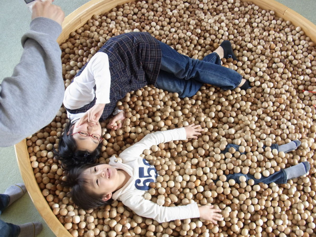 姉弟仲良く木のお風呂で記念撮影