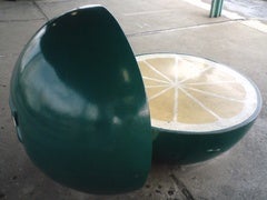 旅行先の大分駅ホームで、特産品かぼすの椅子を発見。