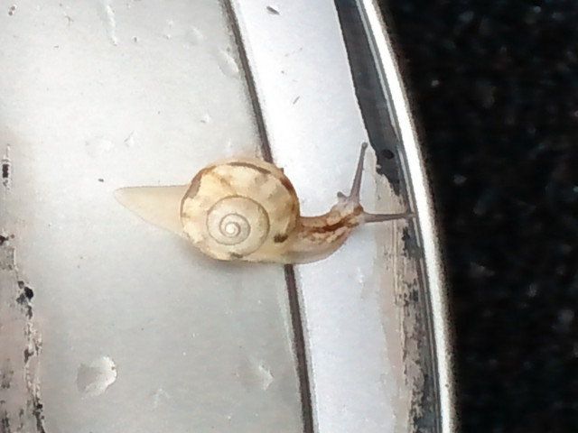 朝、会社の駐車場に車を停めたら隣の車に可愛いお客さま。