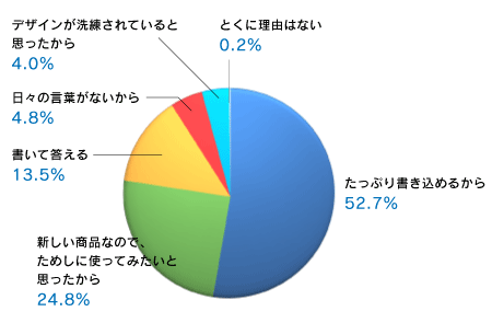 やはりカズンの最大の特徴である「たっぷり書き込める」が過半数を締めています。では、この設問にたいして、選択肢から選ばず、「書いて答える」の欄に記述してくださった方々のご意見を理由別にご紹介しましょう。