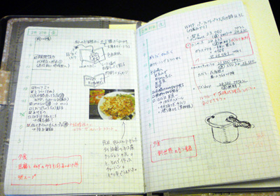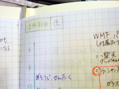 日付と時間軸を色鉛筆で手書きしただけですが、もう愛着バリバリです。その言葉どおりにバリバリと使っているので、メモ帳のミシン目が時々ピリッと切れてしまいます。が、おかまいなし。今まで通りスケジュールはもちろん、手帳CLUBやガイドブックの皆さんの使い方を参考に、やったこと、ふと思い浮かんだもの、料理の写真、もらった手紙に付いていたシールなどなど書いては貼り、貼っては書き、楽しく楽しく持ち歩いています。
