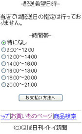 ![]() お支払い方法の 選択画面になりますが、 「ほぼ日ストア・ケイタイ版」での お支払い方法は 代引きのみとなりますので、 このまま 「注文内容確認へ」を クリックしてください。 |